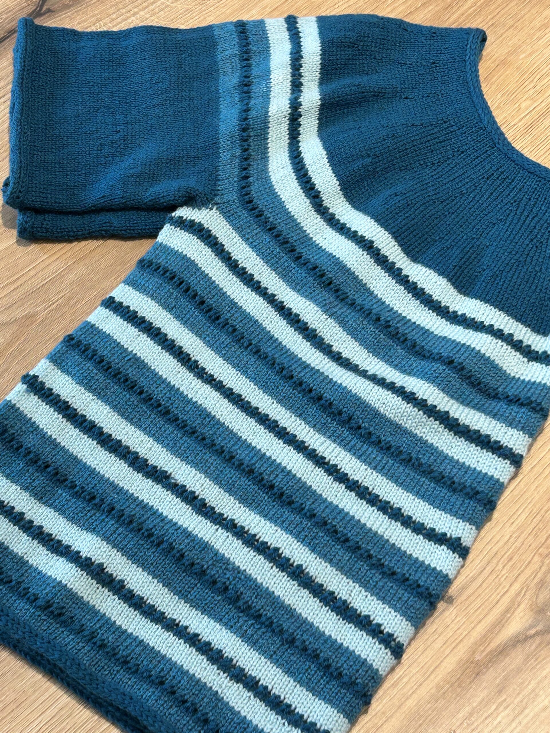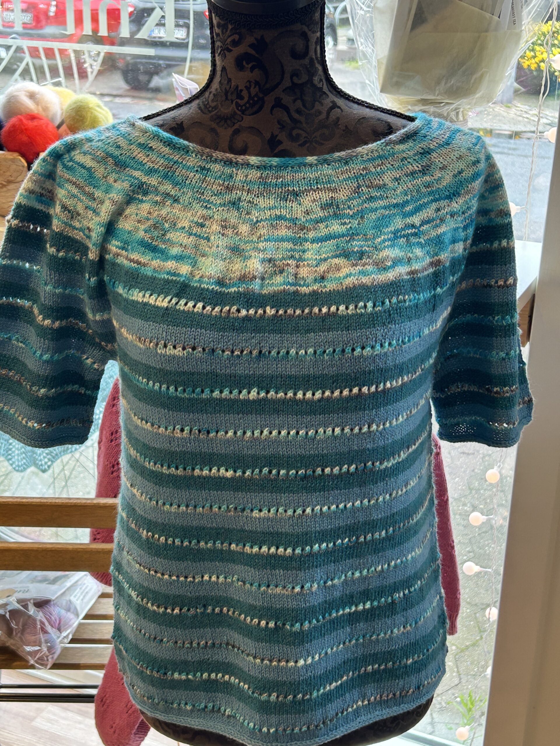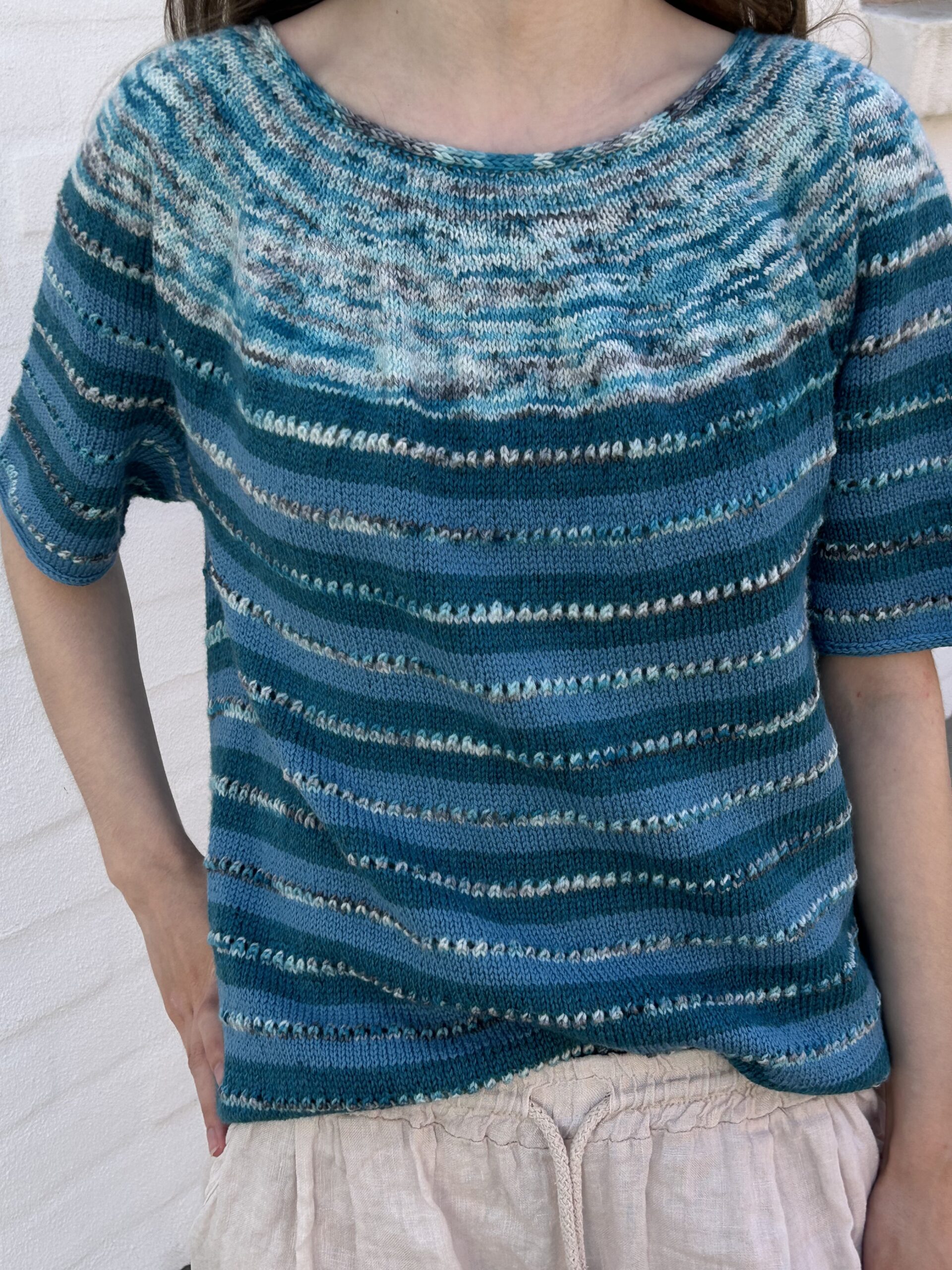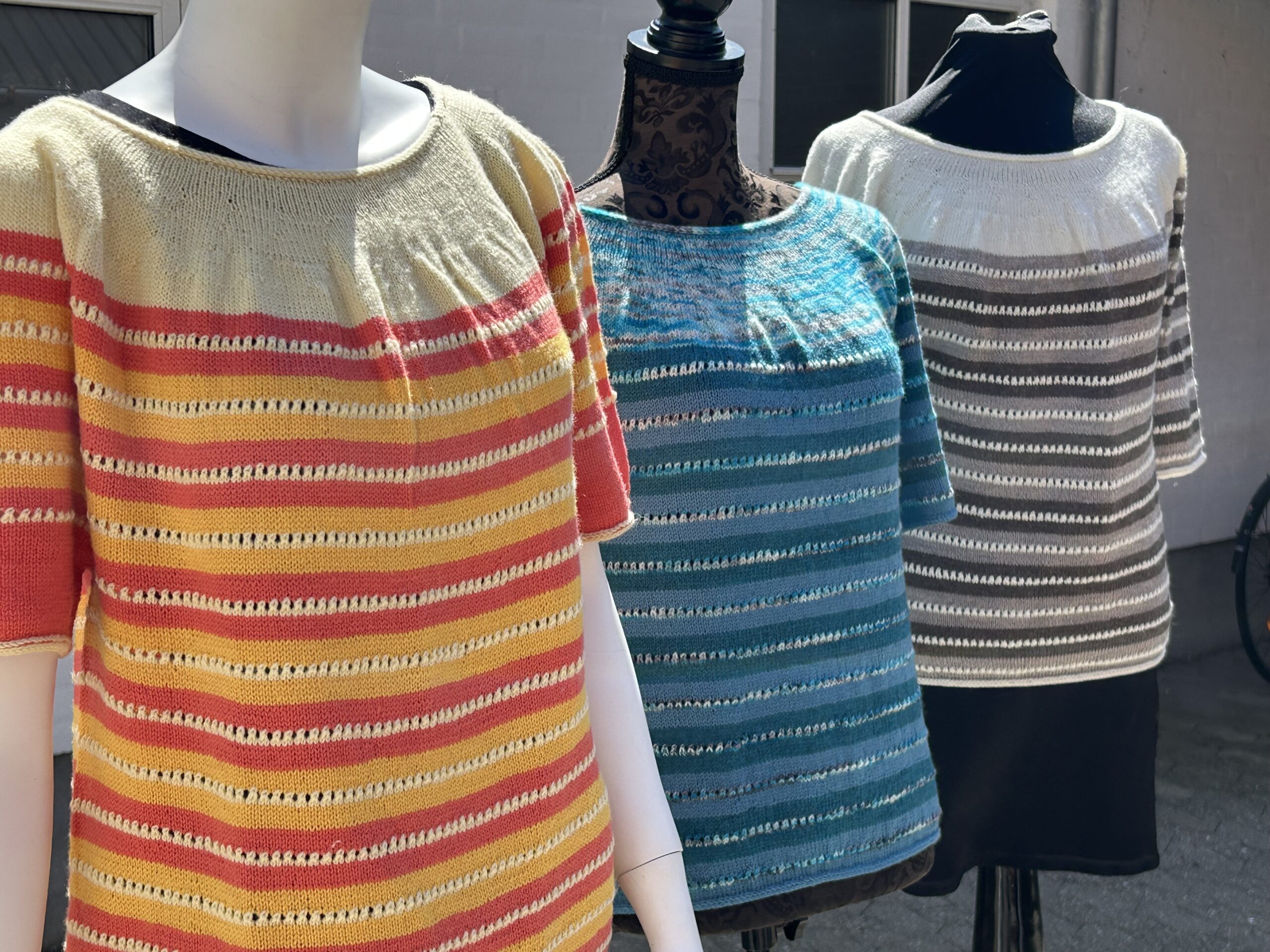 Den blå med meleret bærestykke er strikket i Knit ‘n Knots håndfarvede Merino samt Arwetta.